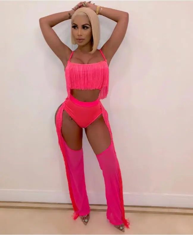 SALE Sexy Women 2PCS Set Hollow Out Tassel Pants Swimsuit Bikini Cover Up Mesh High Waist Loose Long Tro